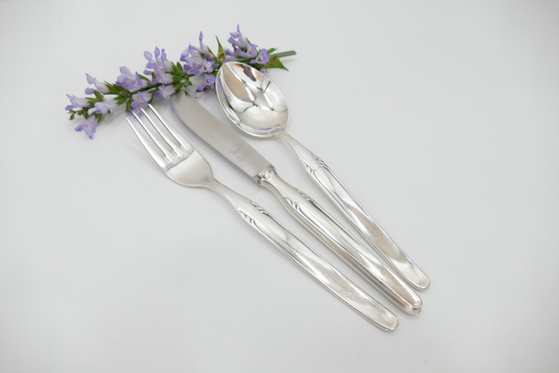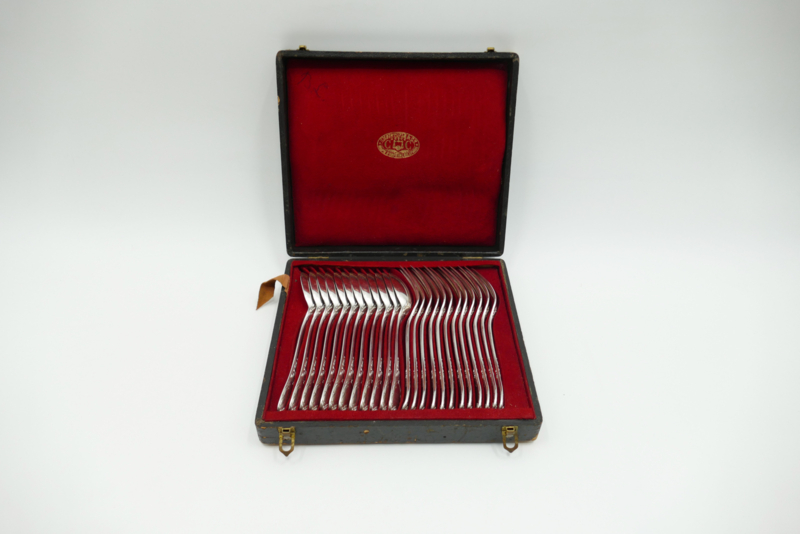 Jäger Solingen - Verzilverde bestekcassette - 83-delig/12-persoons - Duitsland, 1937-1950Dit fraaie bestek met klassiek patroon is in de periode 1937-1955 vervaardigd door de Duitse bestekfabriek Jäger, Solingen. Dankzij Jäger's specialisatie in de productie van het basismetaal Alpacca waren hun verzilverde…