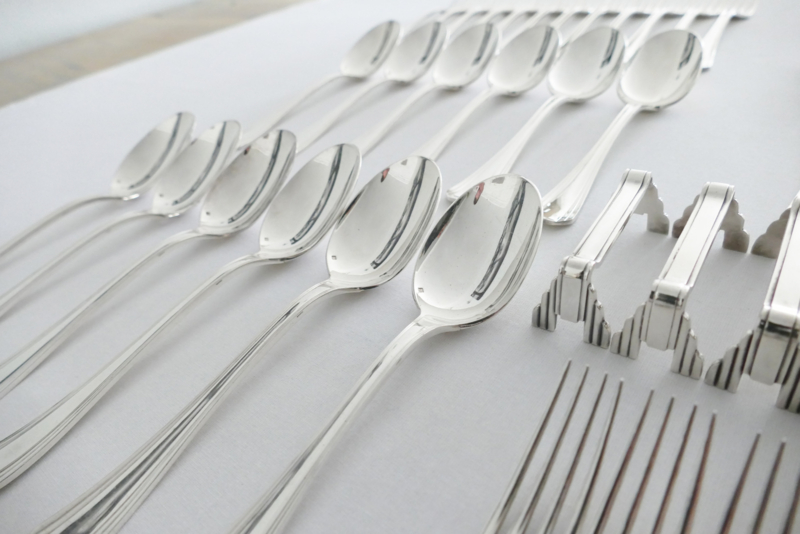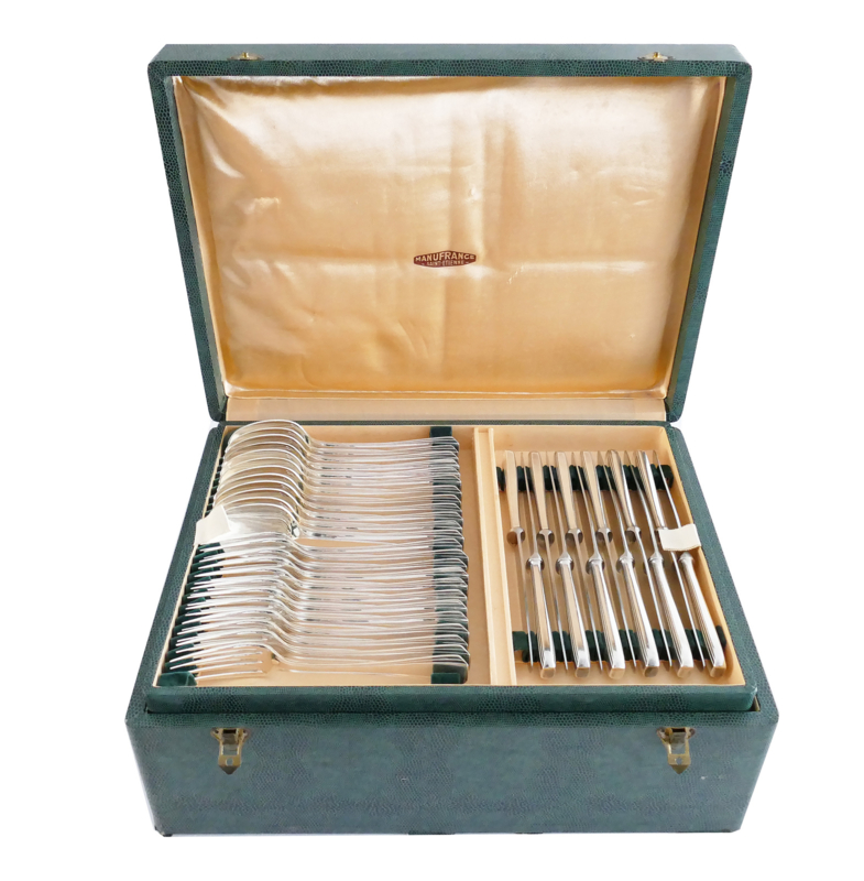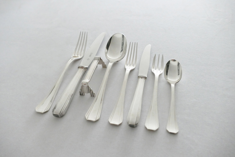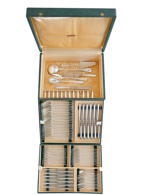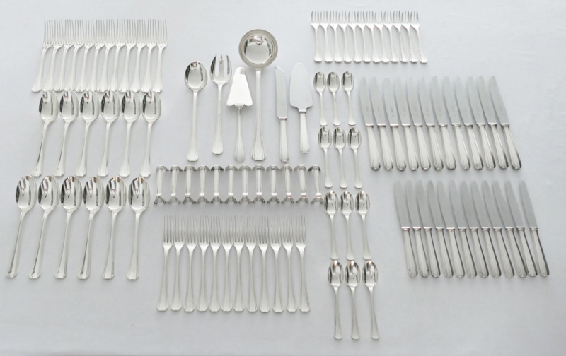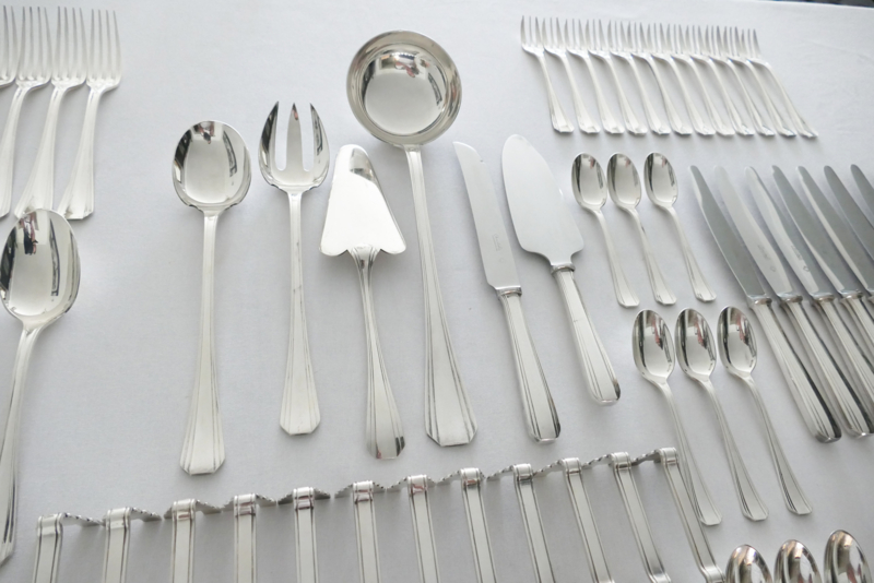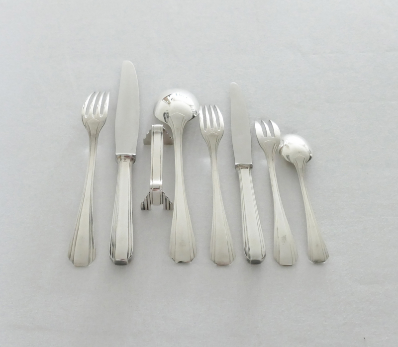 Schitterende verzilverde bestekset uit de Art Deco periode van Christofle, in model Boreal. Dit model werd in 1929 ontworpen door Luc Lanel en is een pure uiting van deze stijl, met een waaiervormig patroon en geometrische vormgeving. Het geheel is geschikt voor 12 tafelgasten en bestaat in totaal uit 102 zwaar verzilverde bestekdelen.