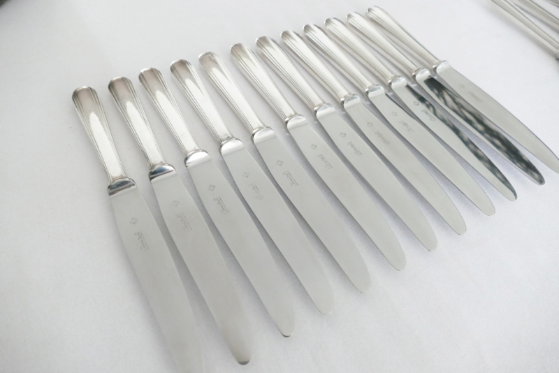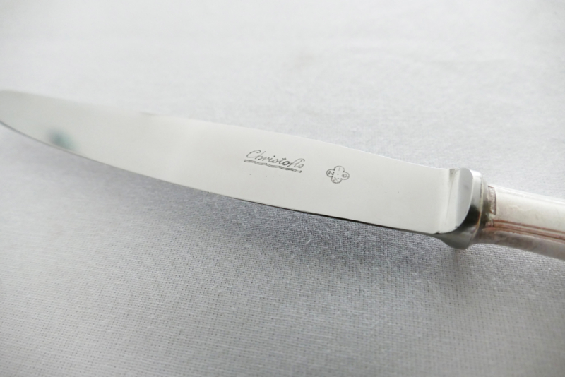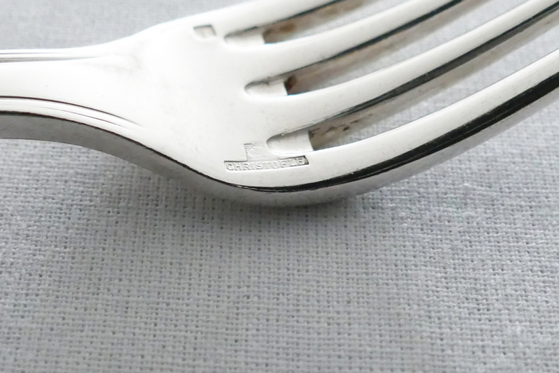 Alle delen gemerkt onder de tanden van de vorken en in de lepelbakken met [O-Weegschaal-C][Christofle][O-Schaakstuk-C][France]. De lemetten van de messen in roestvrijstaal, gemerkt "Christofle Inox".