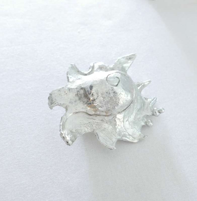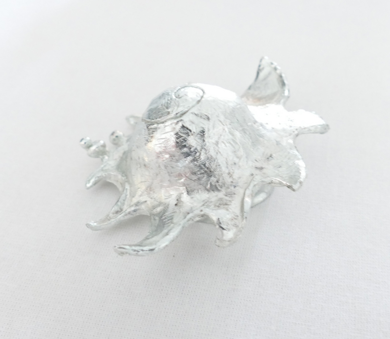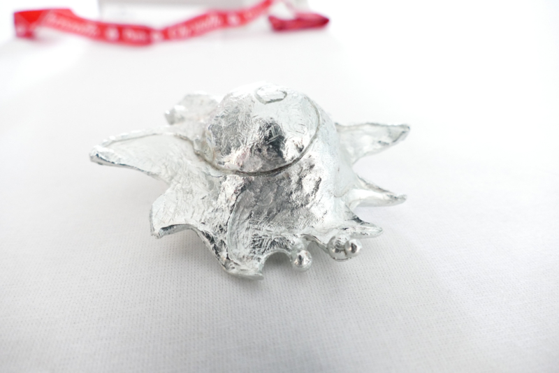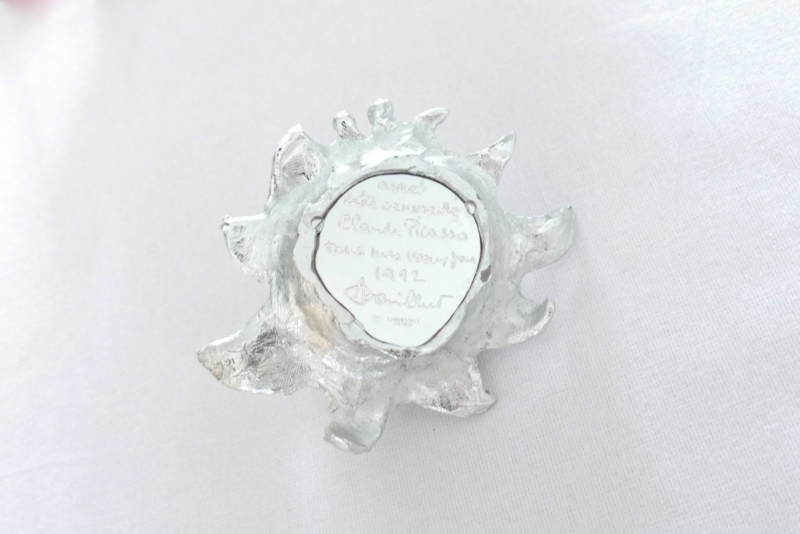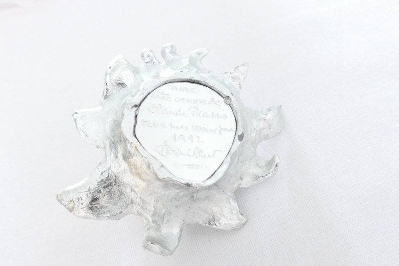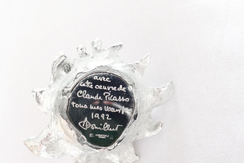 Verzilverde presse-papier - "Soleil" - door Claude Picasso ontworpen in samenwerking met Christofle. De sculptuur heeft de vorm van een zon of ster. Wanneer het geschud wordt maakt het een ratelend geluid.