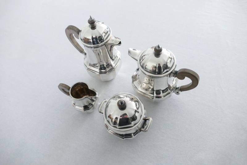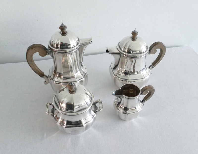 Een Christofle verzilverd koffie- en theeservies, vervaardigd voor het Britse warenhuis Kirby, Beard & Co en hun vestiging in Parijs. De kannen in Art Deco vormgeving, met octagonale, serpentijnse vormgeving en hardhouten handvaten. De set dateert uit de periode van 1935 tot de vroege jaren 1950.