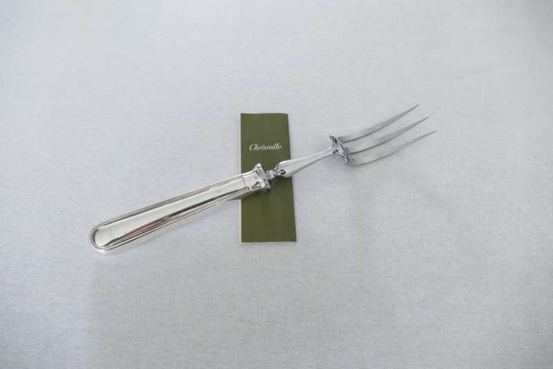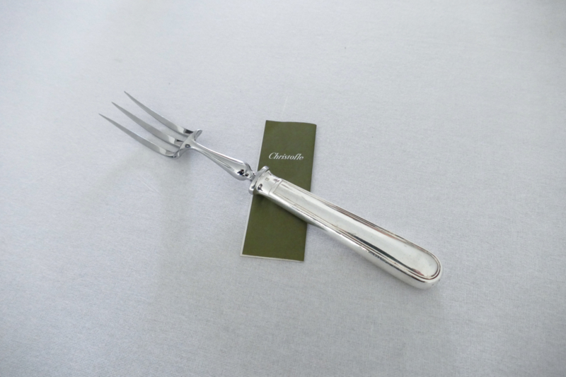 Een verzilverde voorsnijvork van het Franse zilverhuis Christofle - uit de Albi collectie. Ronde vormgeving met een filetlijn.