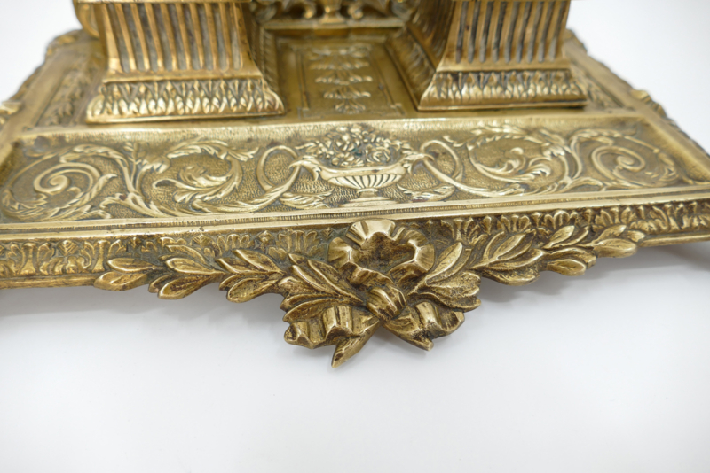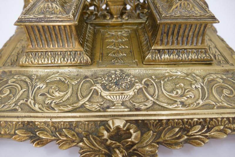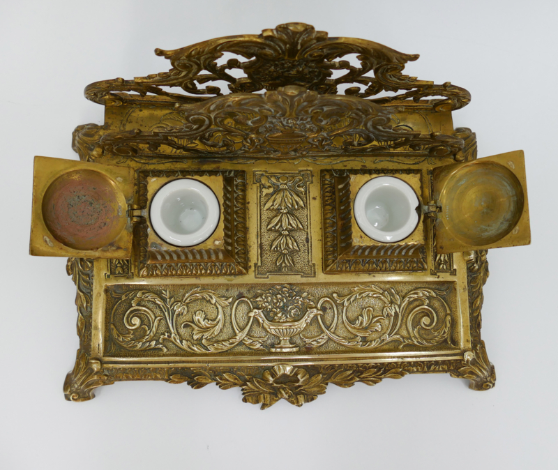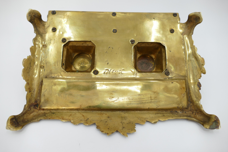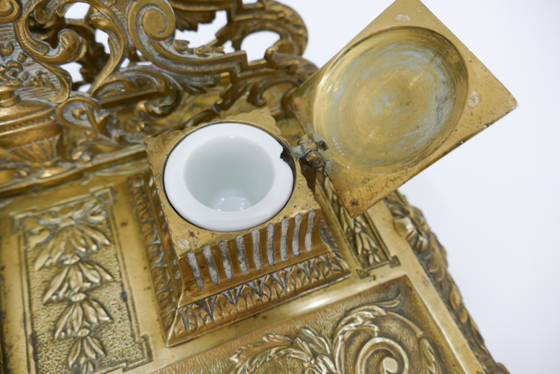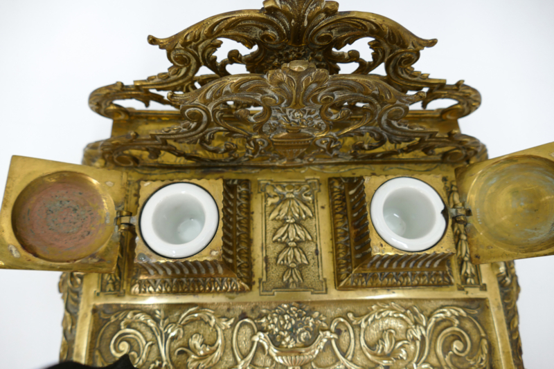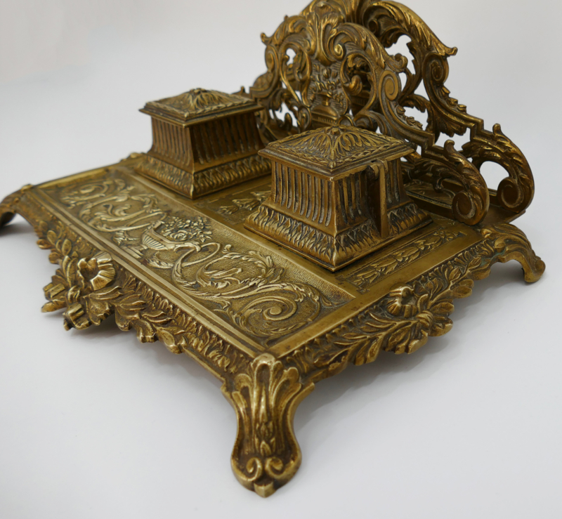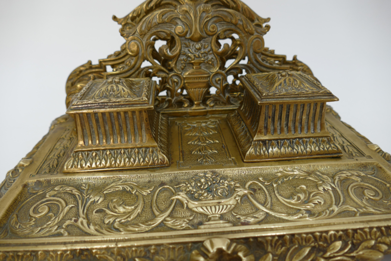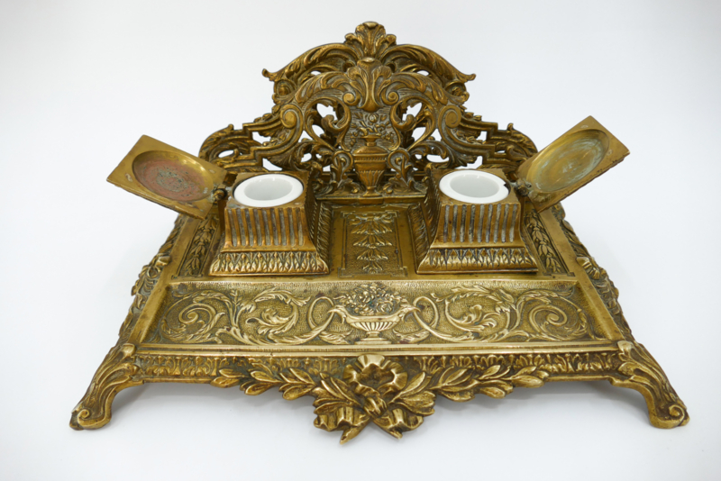 Een elegant inktstel uit de tweede helft van de 19e eeuw, vervaardigd uit gegoten messing. Het inkstel dateerd van de periode 1870-1890 en combineerd inkpotjes, brievenhouder en pennenbakje. Fijn versierd met de voor deze periode typisch ecclectische stijl: arabesken, strikken, balustervazen en acanthusbladeren. Fraai is ook de met bloemen gevulde vaas met twee adelaarshoofden welke prijkt op het midden van het pennenbakje.