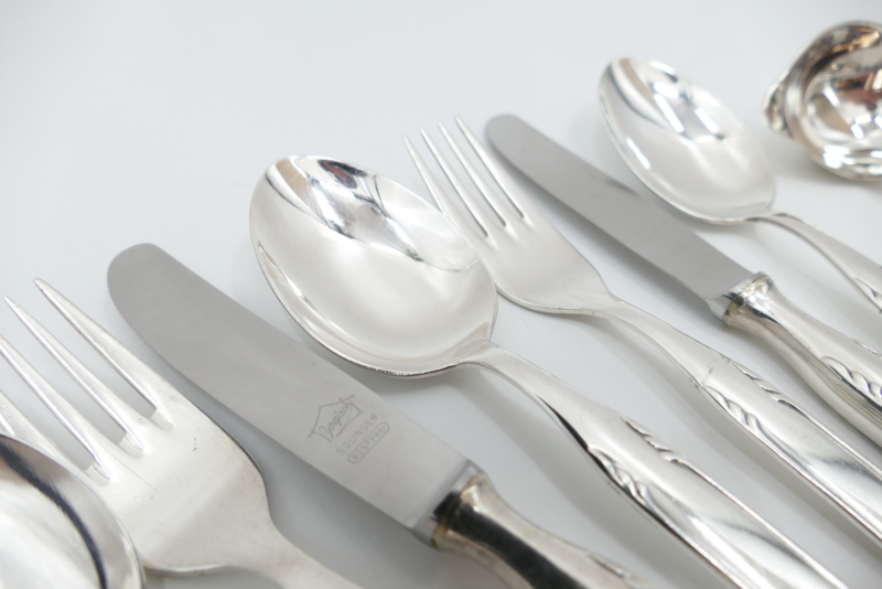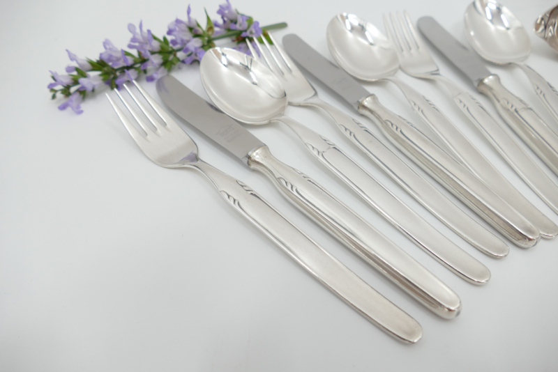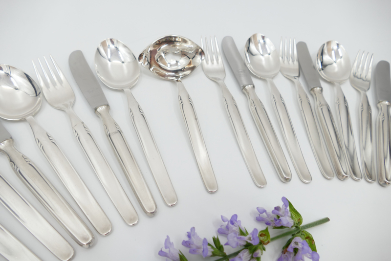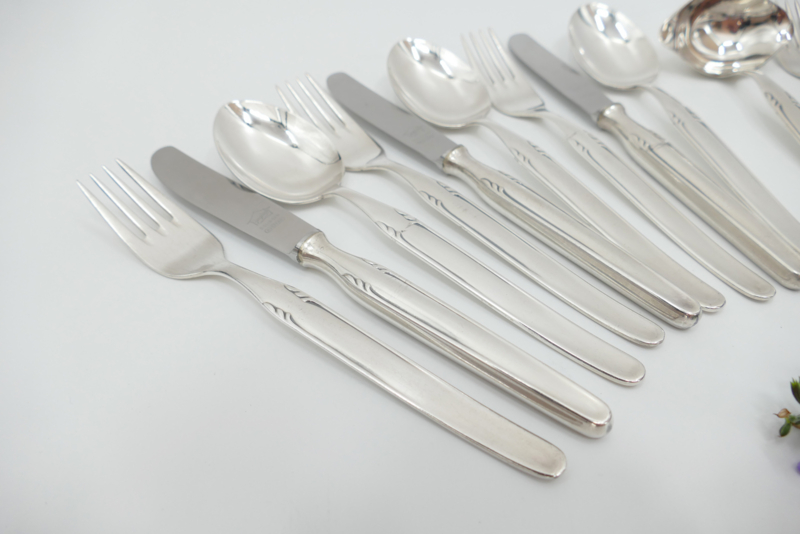 Een fraaie verzilverde bestekset met een typisch jaren 1960-patroon. Deze set is geschikt voor 6 personen en verzilverd op basis van 100 gram. en in uitstekende conditie.