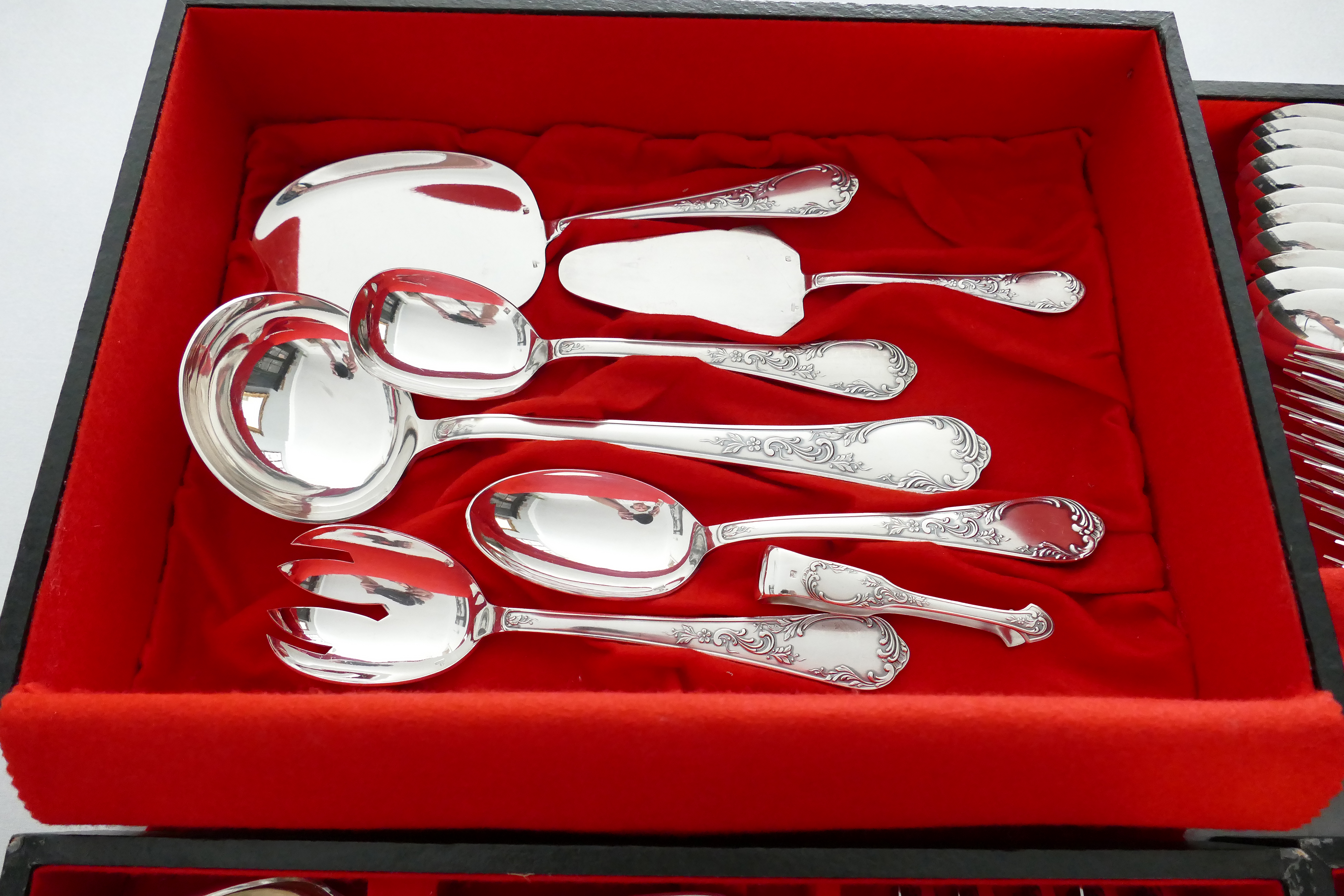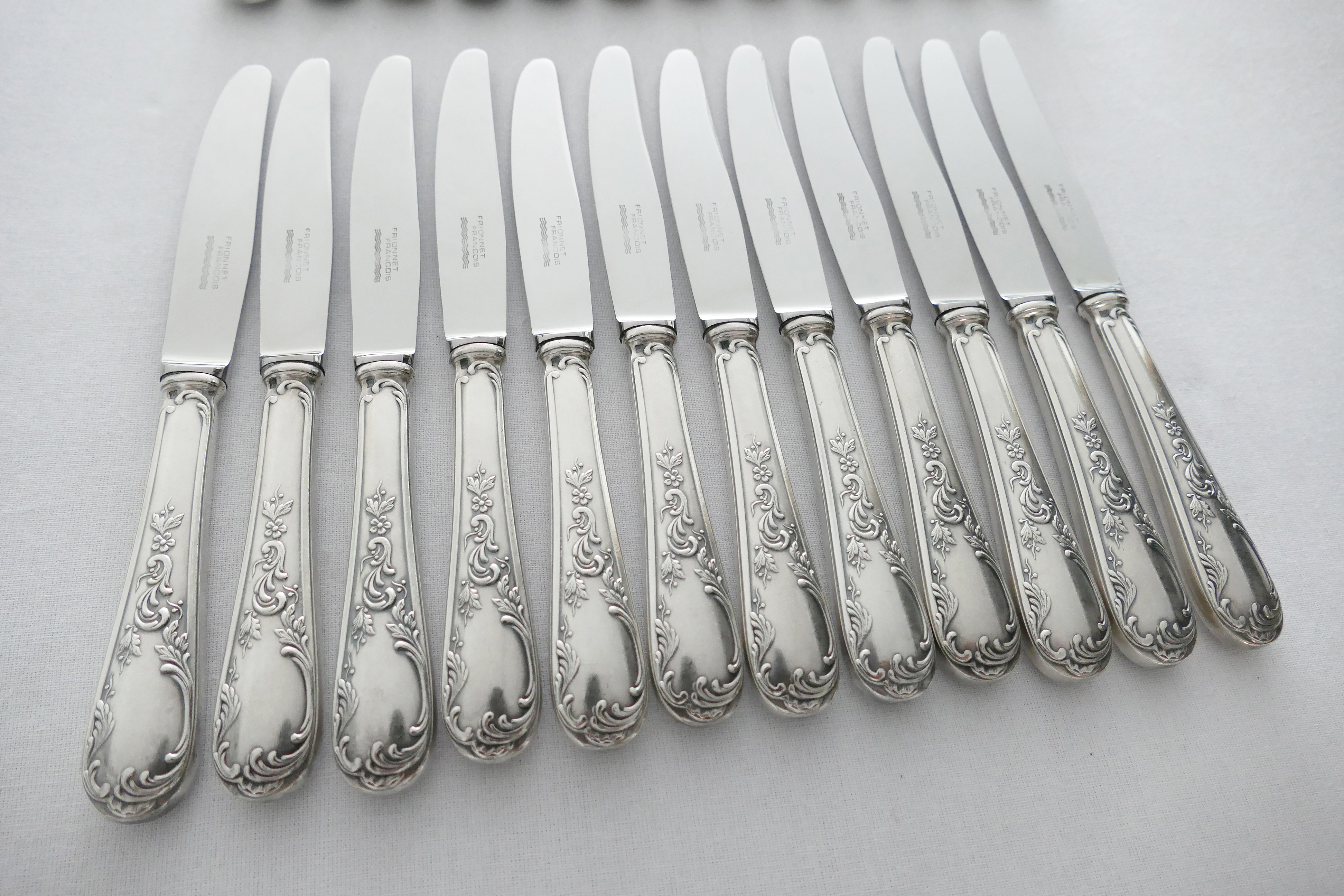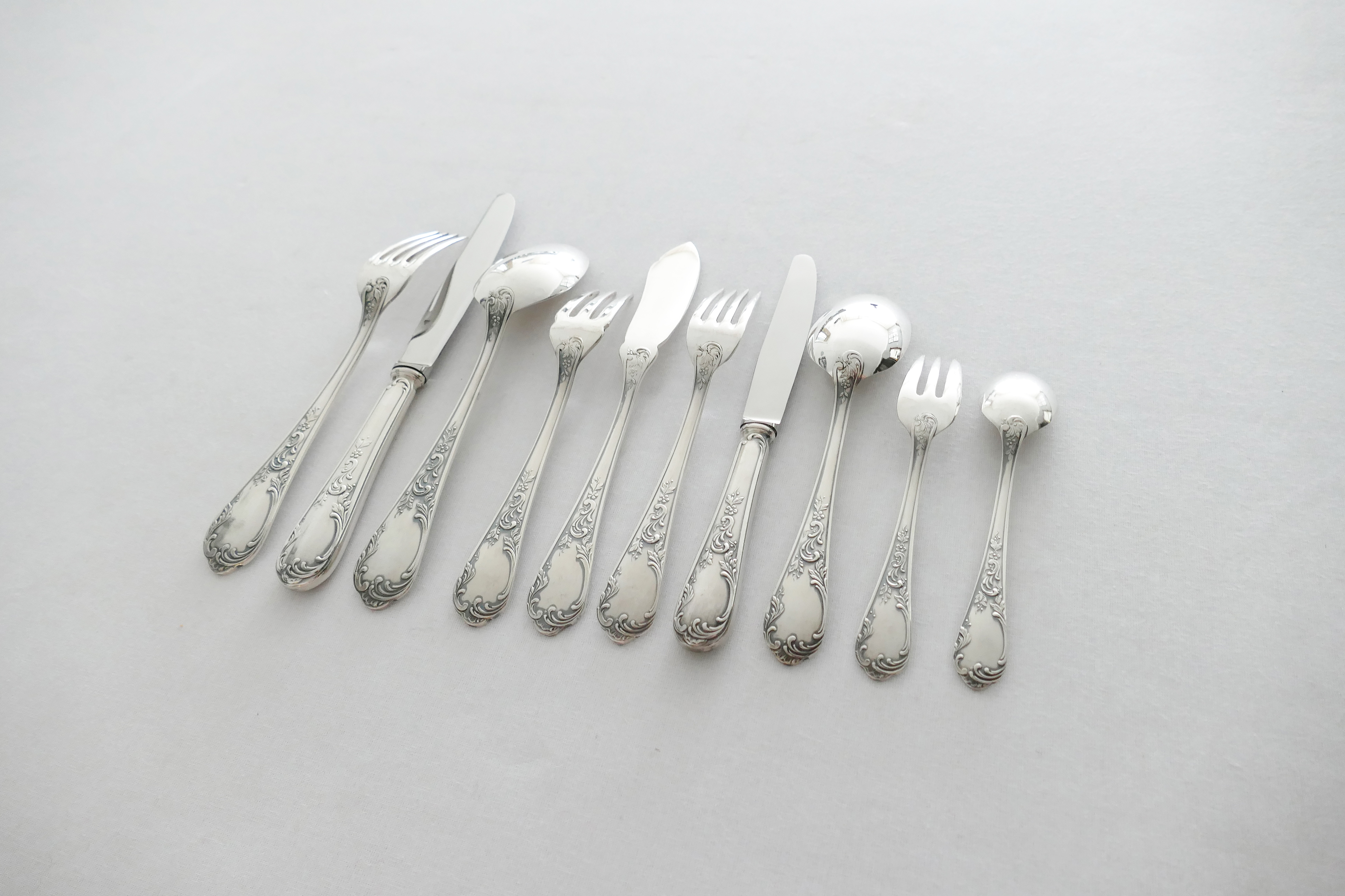 A very elegant silver-plated cutlery set in its original case, crafted by silversmith Francois Frionnet around the 1960's-1970's. The pieces are decorated with a Louis XV-style "Elysée" pattern featuring Rococo scrollwork, flowers, and laurel leaves. The set comprises 127 pieces and is suitable for twelve guests. The original black leather canteen has four drawers with red felt inserts and anti-oxidation cloths. These provide perfect storage and protection from oxidation. Consisting of: