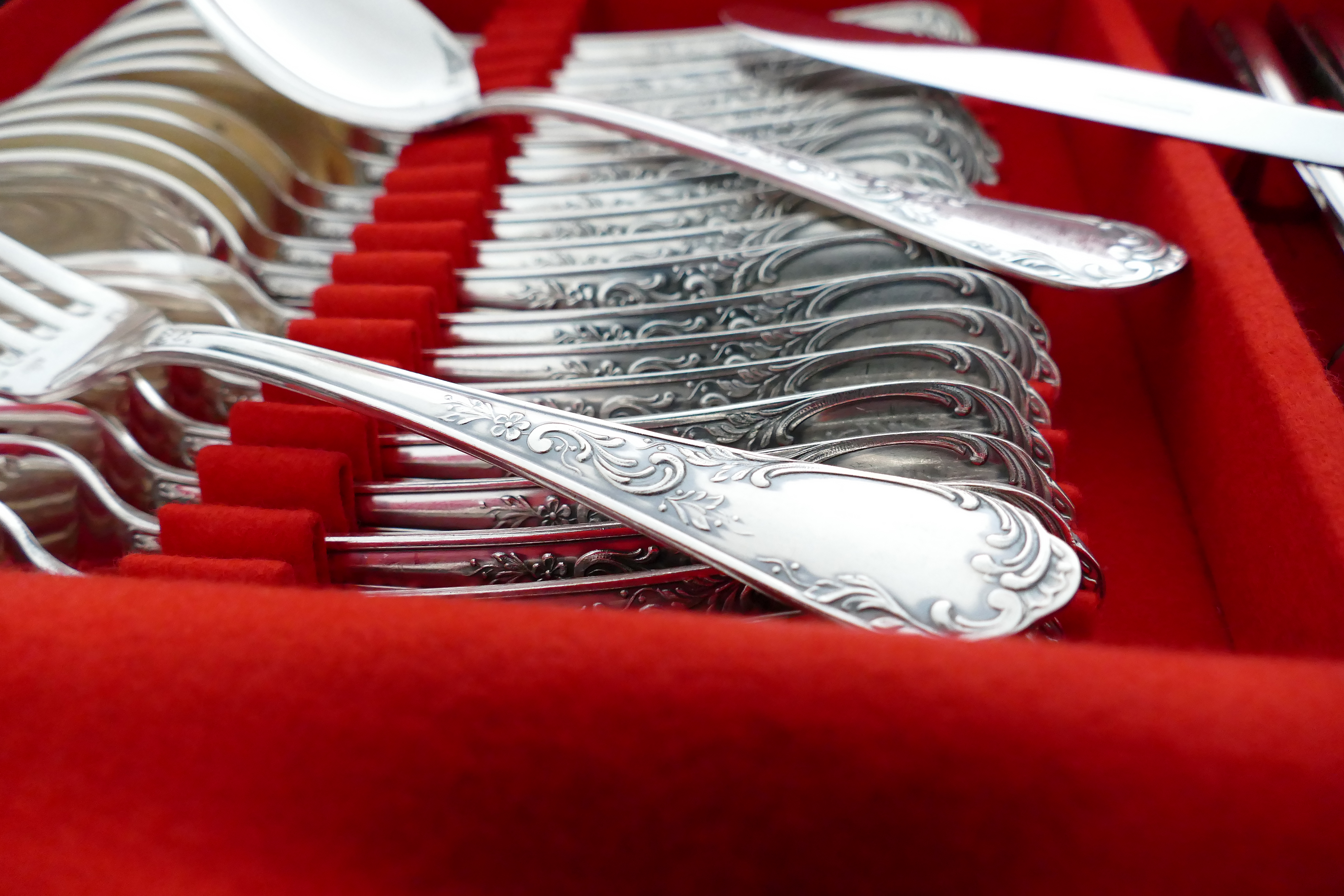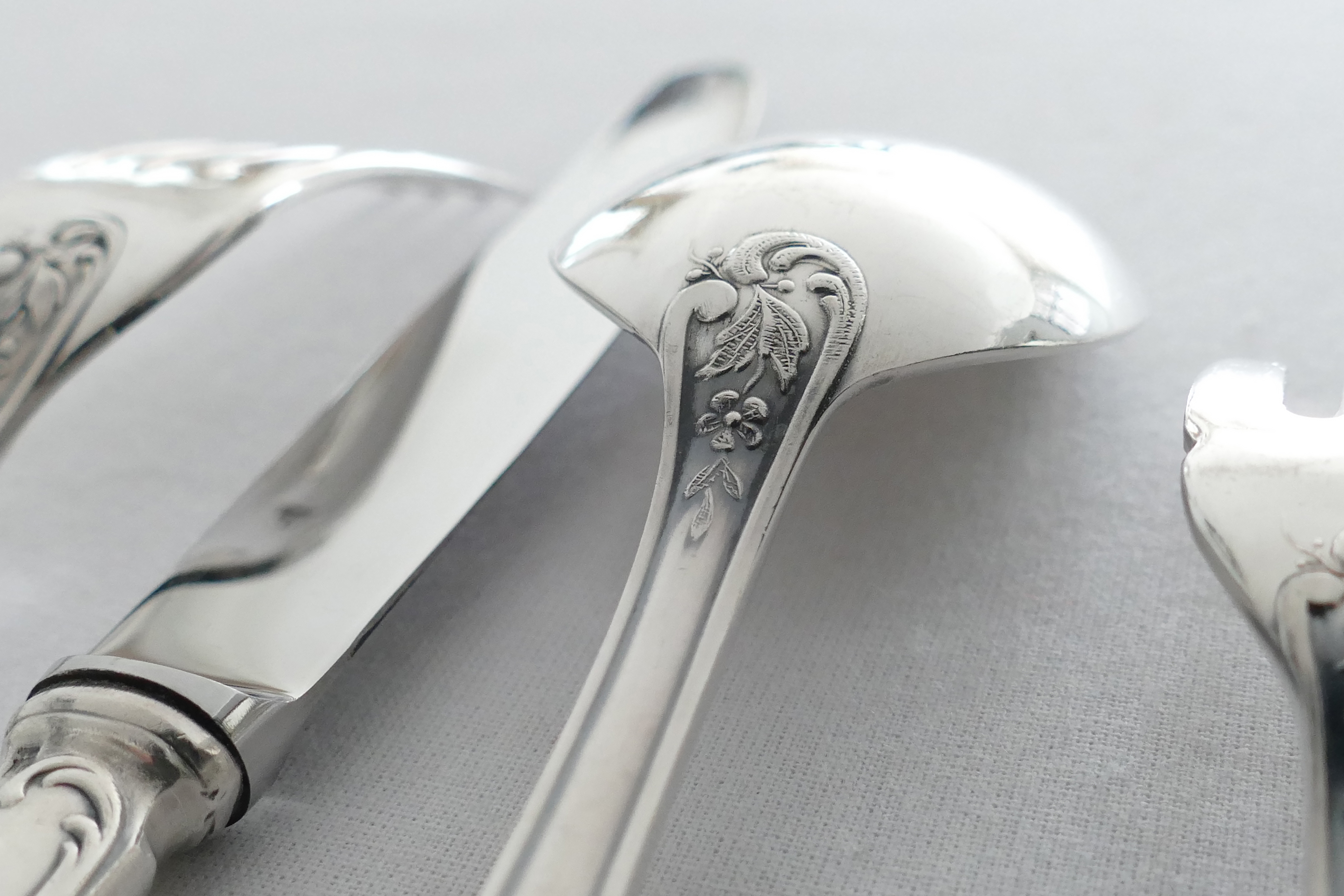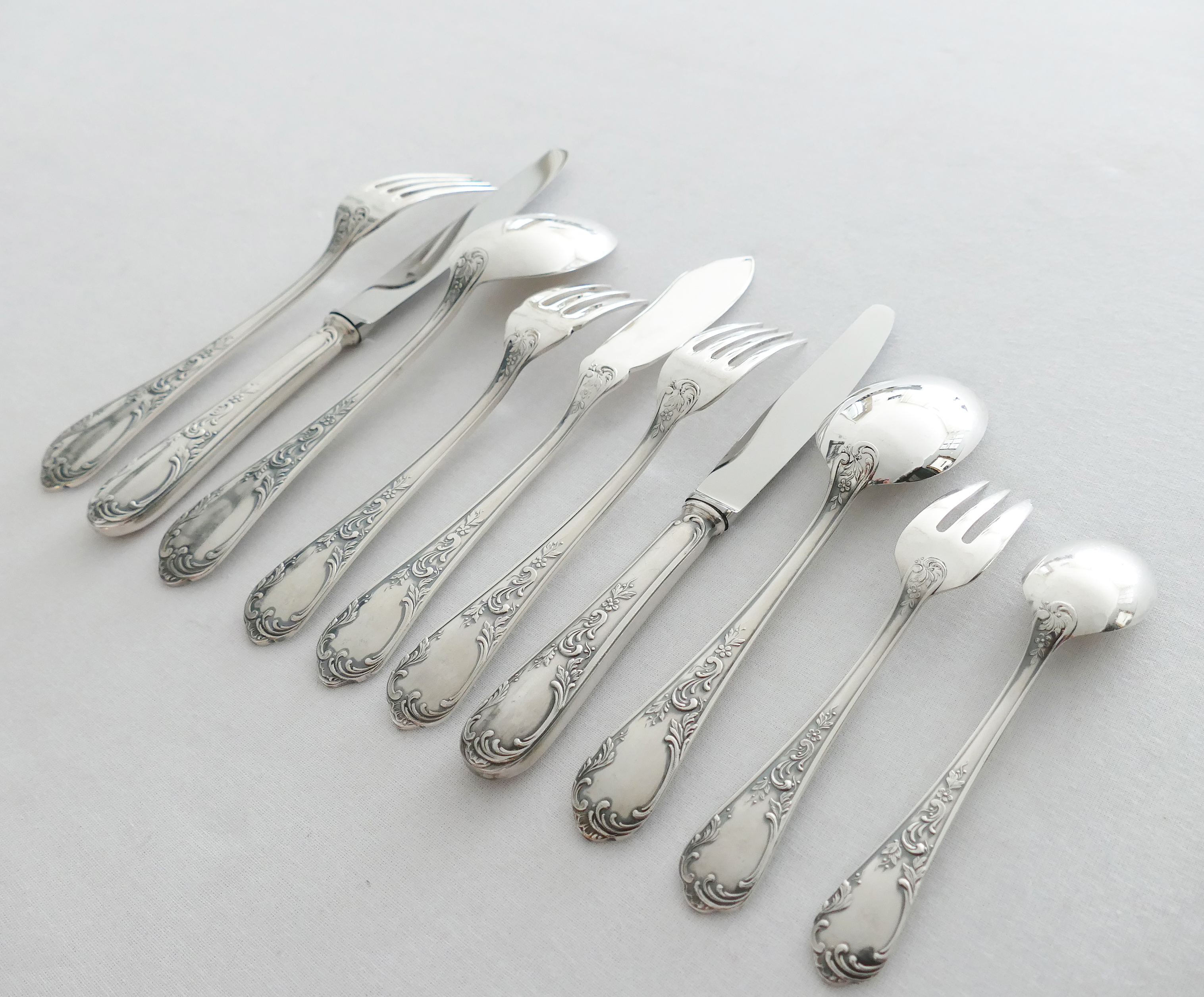 A very elegant silver-plated cutlery set in its original case, crafted by silversmith Francois Frionnet around the 1960's-1970's. The pieces are decorated with a Louis XV-style "Elysée" pattern featuring Rococo scrollwork, flowers, and laurel leaves. The set comprises 127 pieces and is suitable for twelve guests. The original black leather canteen has four drawers with red felt inserts and anti-oxidation cloths. These provide perfect storage and protection from oxidation. Consisting of:
