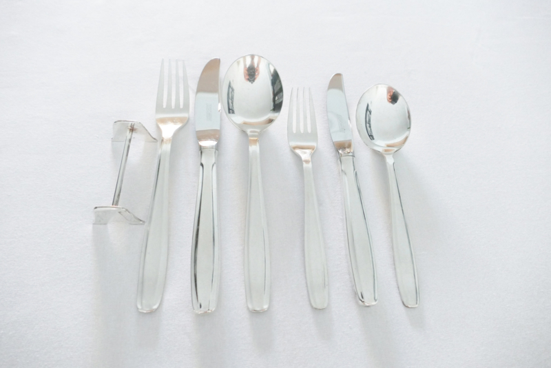 A silver-plated cutlery set preserved in its original canteen, in the Progression pattern Gero, Zeist. This model was designed by Georg Nillson in 1950 for the Gerofabriek and remained in production until 1965. The design still displays Nilsson's typical pre-war Art Deco influences, though it is also clear that this era is now well and truly in the past. The design is rounder and more streamlined.