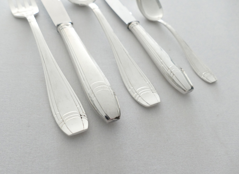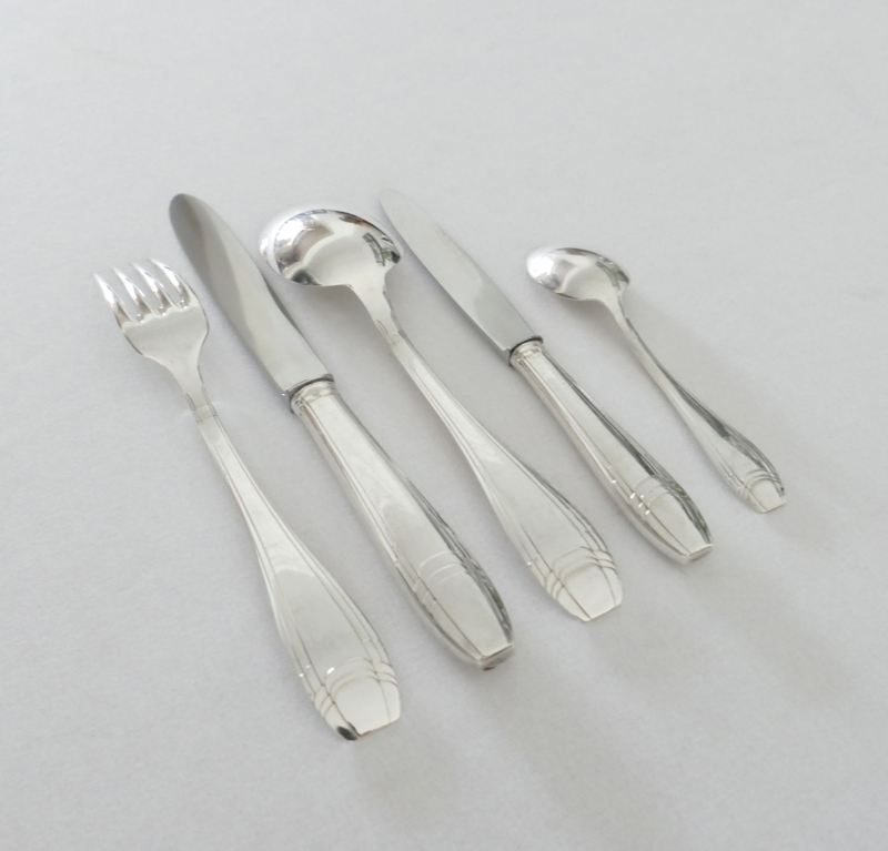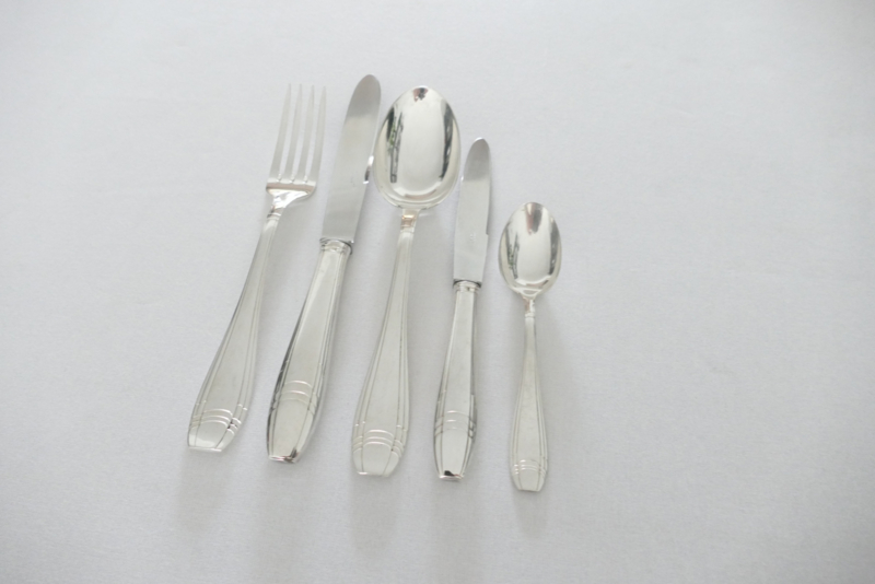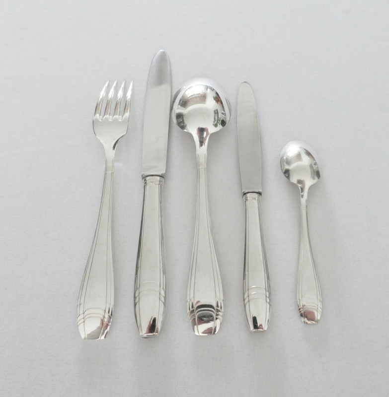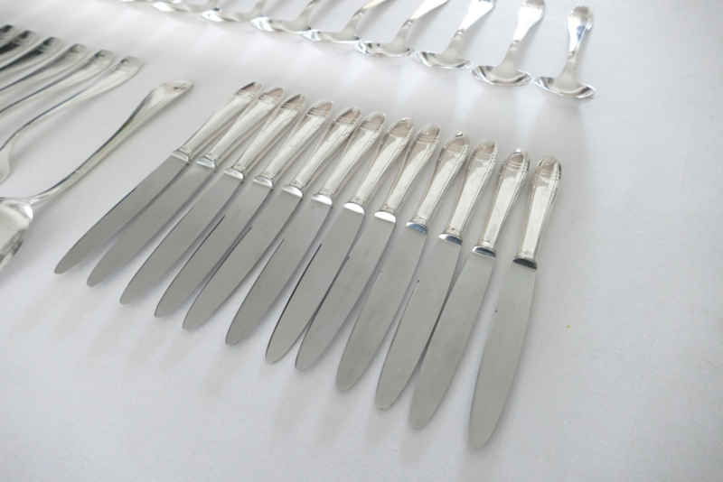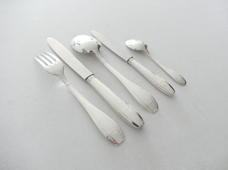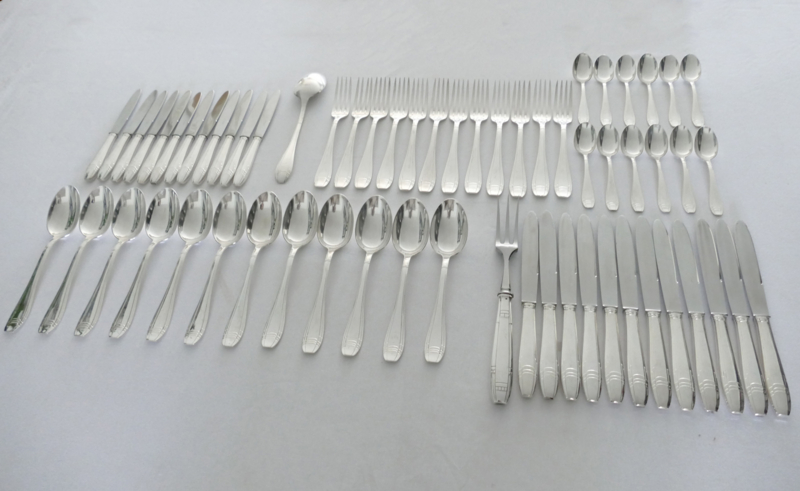Beautiful silver-plated Art Deco cutlery for 12 table guests. The cutlery was manufactured by Orfevrerie J. Brille in the 1920's. The pieces are beautifully designed with a geometric pattern in typical Art Deco style. The set includes dinner cutlery, a set of smaller knives, and coffee spoons.