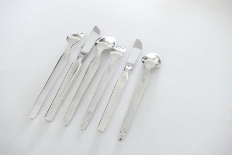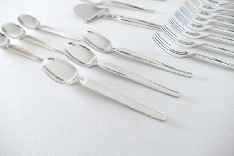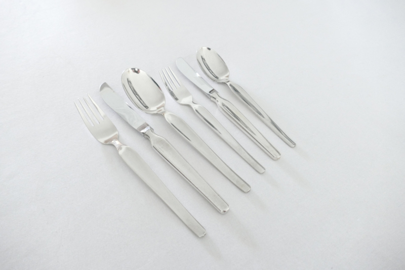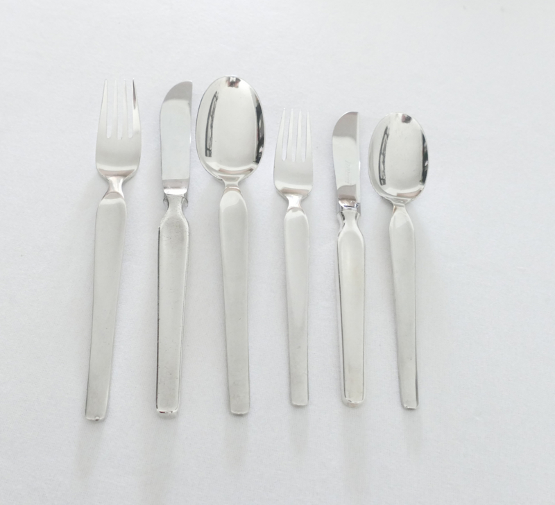 Stunning Mid-Century silver-plated cutlery – designed in 1956 by Dick Simonis for Gero, Gerritsen Zeist. This cutlery model features a distinctive design with a tapered handle that becomes progressively thinner towards the end. A slightly wavy surface lends the cutlery a quiet elegance. This cutlery set consists of 48 pieces and is suitable for six dinner guests.