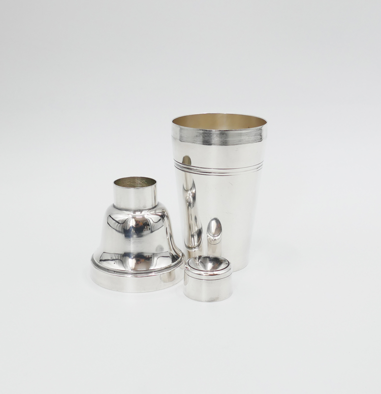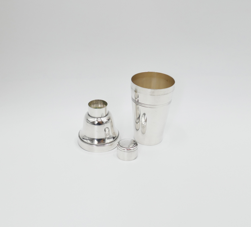 Beautiful French cocktail shaker from the Art Deco period, made in the 1920s-1940s. Marked on the underside and in very good condition. The luster of the silver is beautifully preserved. The shaker is complete, with shaker, strainer, and lid. The interior is clean. Please view the photos for an impression.