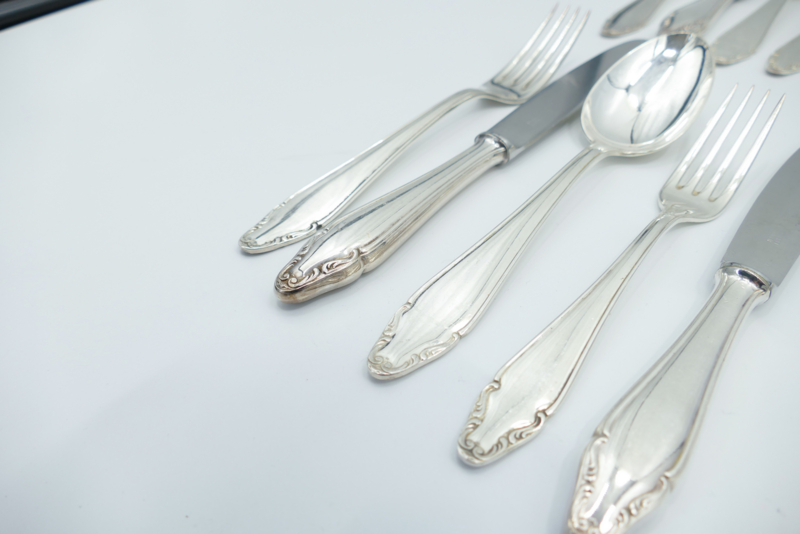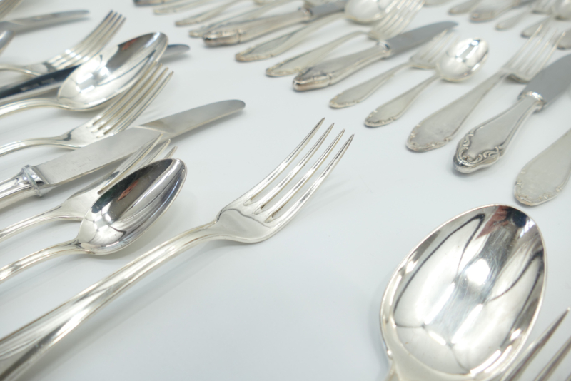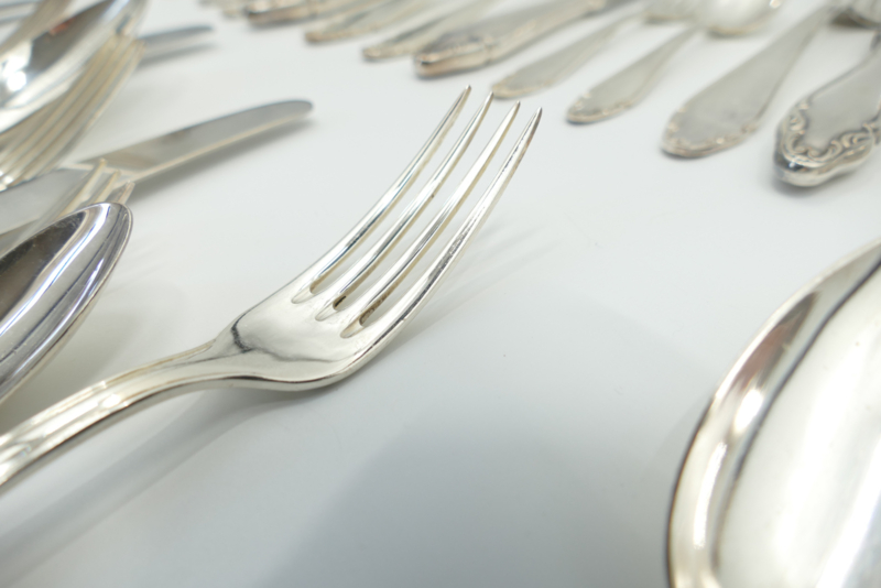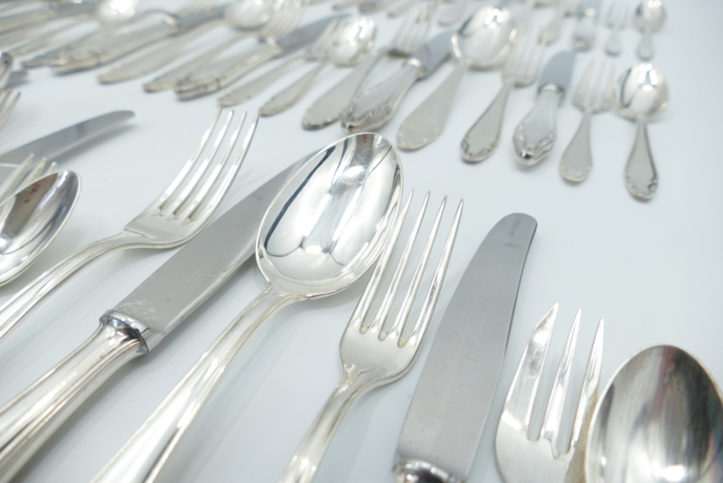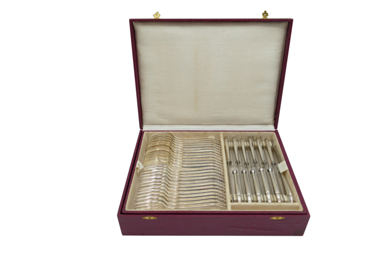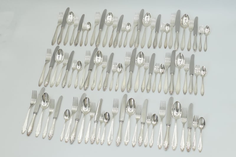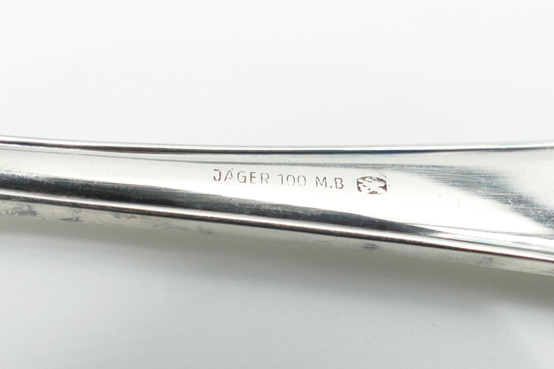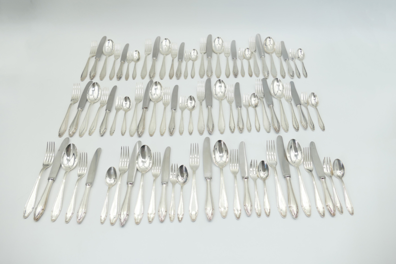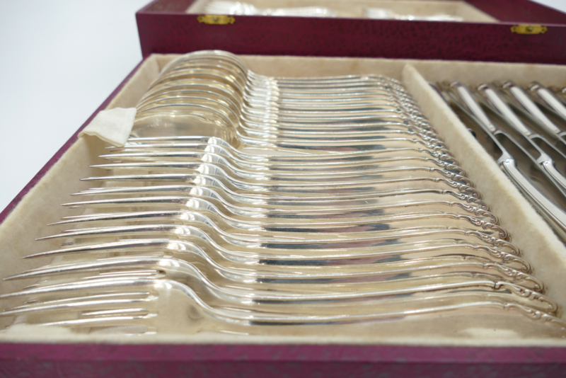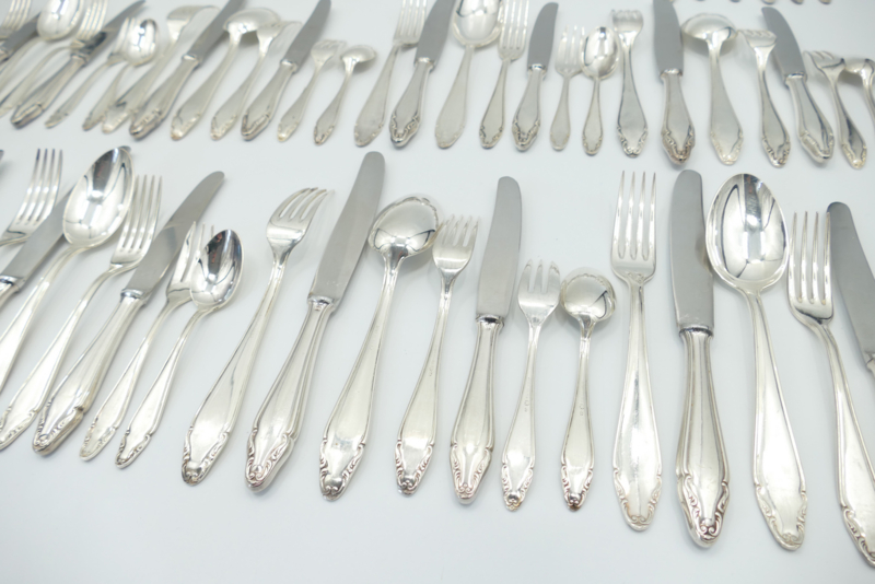 This beautiful cutlery set with a classic pattern was manufactured in the period 1937-1955 by the German cutlery factory Jäger, Solingen. Thanks to Jäger's specialization in the production of the base metal Alpacca, their silver-plated cutlery was of high quality. This set is no exception. It is silver-plated at a rate of 100 grams per 12 place settings, and despite its age, it has perfectly retained its shine.