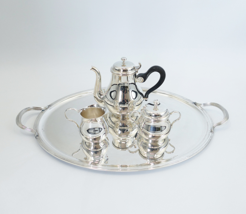 Silver Plated Art Deco Coffee- and Tea set - France - 1920-1940A magnificent silver-plated French Art Deco coffee and tea set on a tray. This set dates from the years between 1920 and 1940. The handles are of Coromandel wood. The spherical jugs, with angular spouts and round lids, are typical…